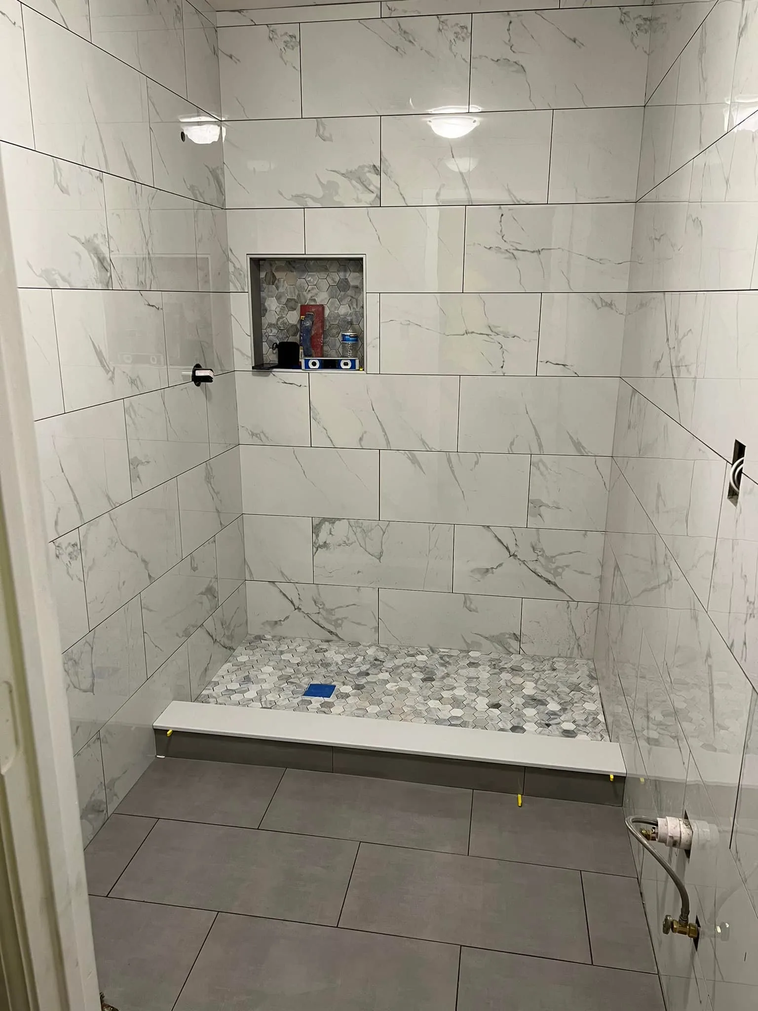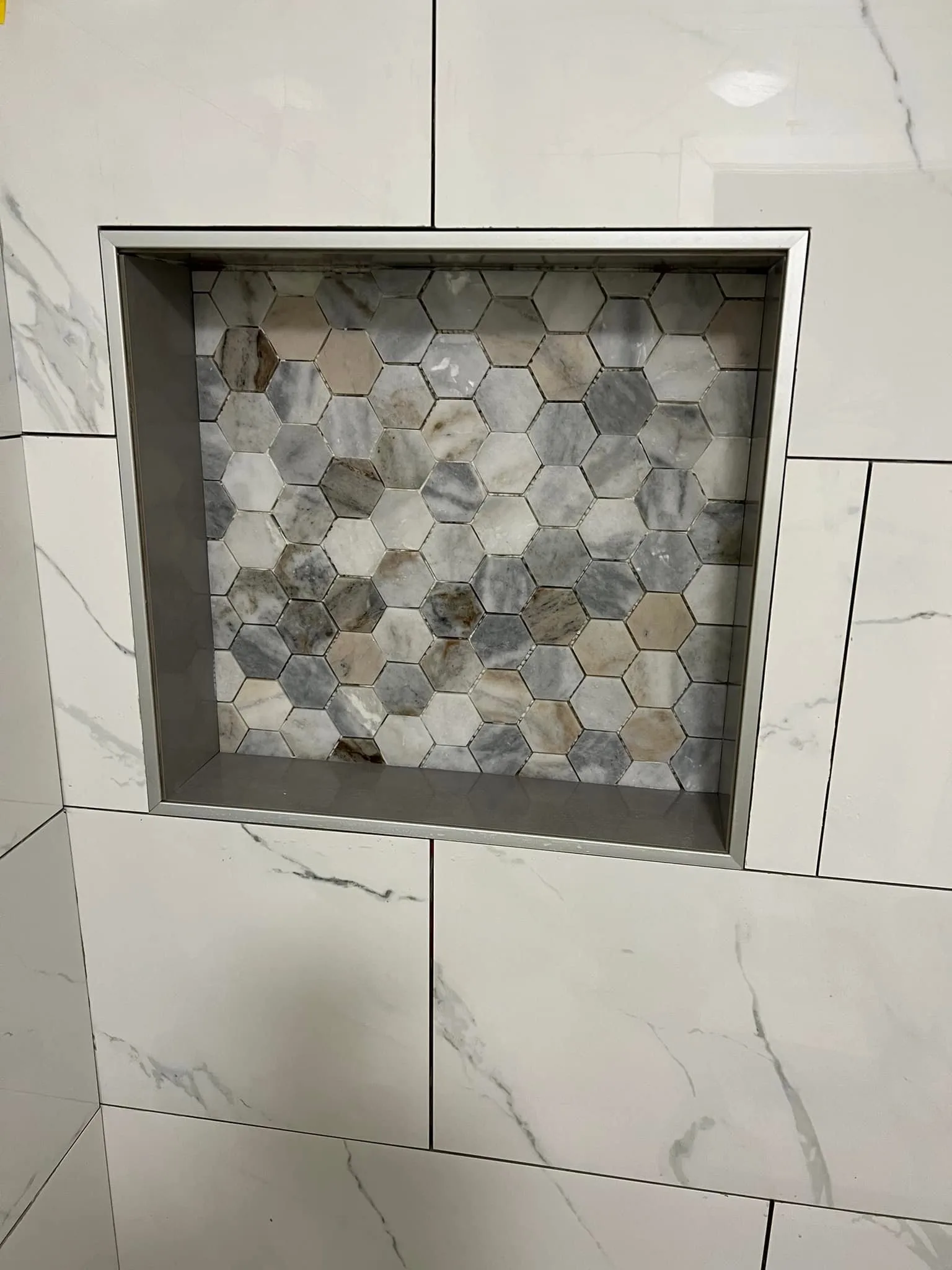 - Custom shower niche with hexagon tile accent