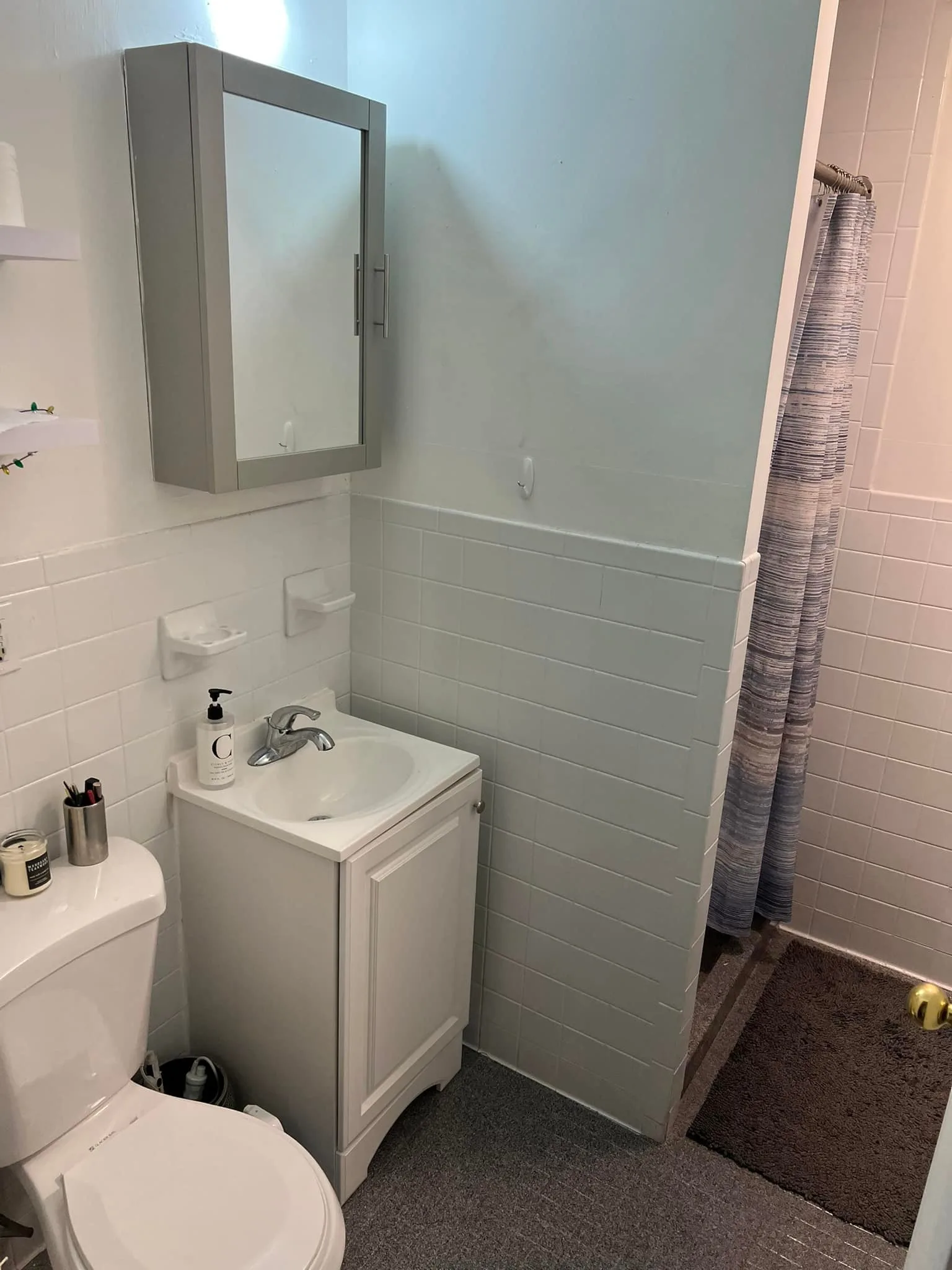 - New vanity, mirror cabinet, and modern lighting