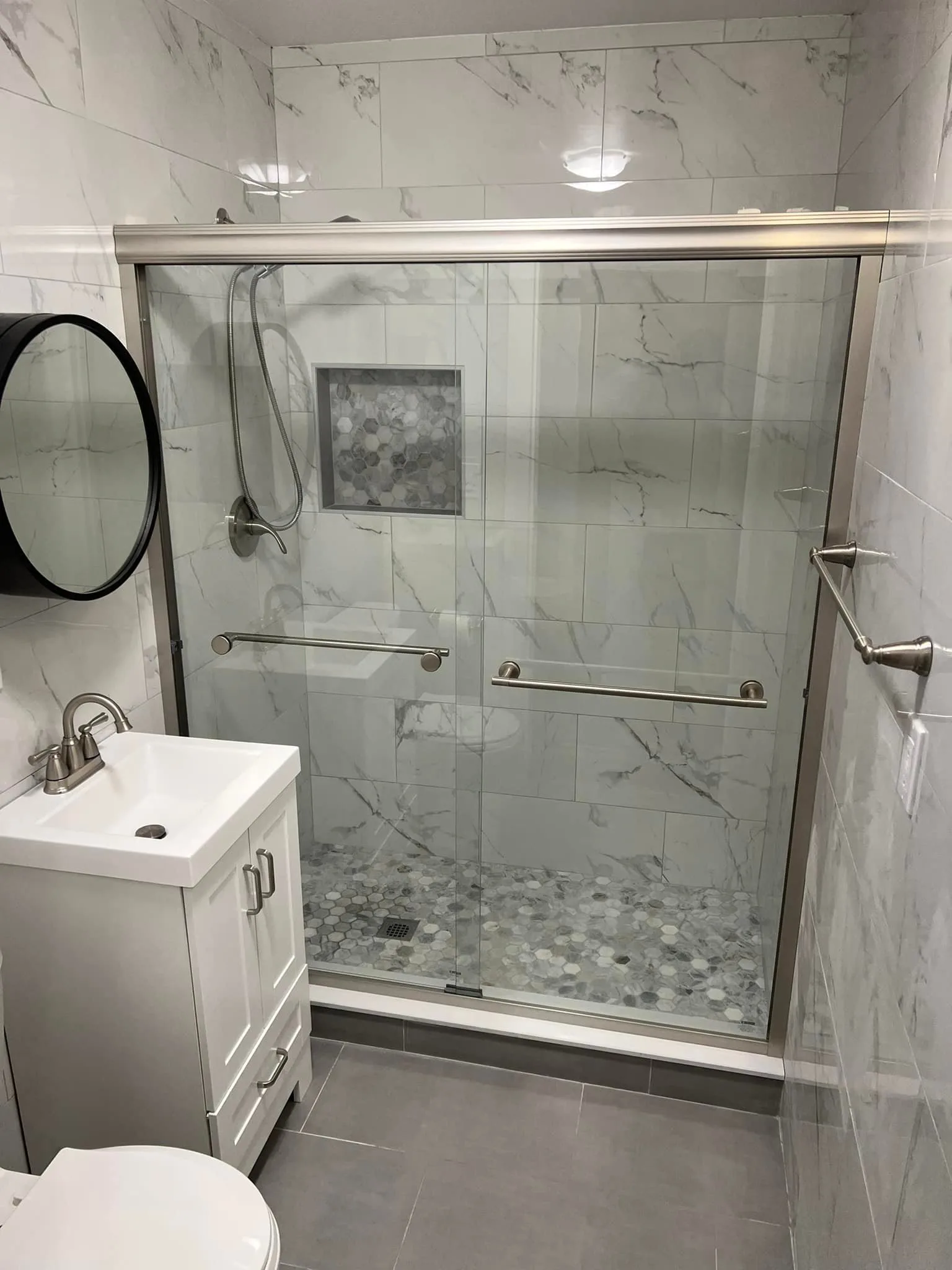 The walls are tiled in large-format white ceramic with gray veining for a clean marble look. The shower features a recessed niche lined with hexagon mosaic tiles for contrast. Large gray floor tiles were used for a grounding effect and durability.