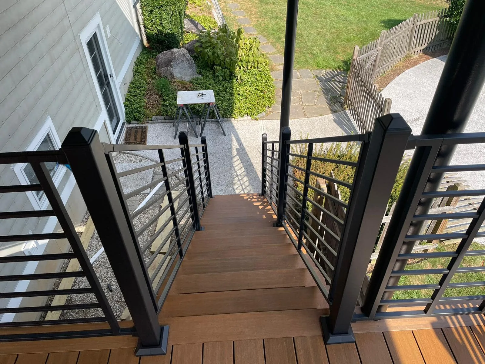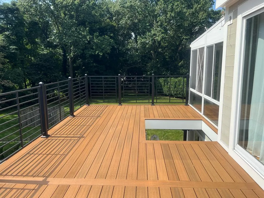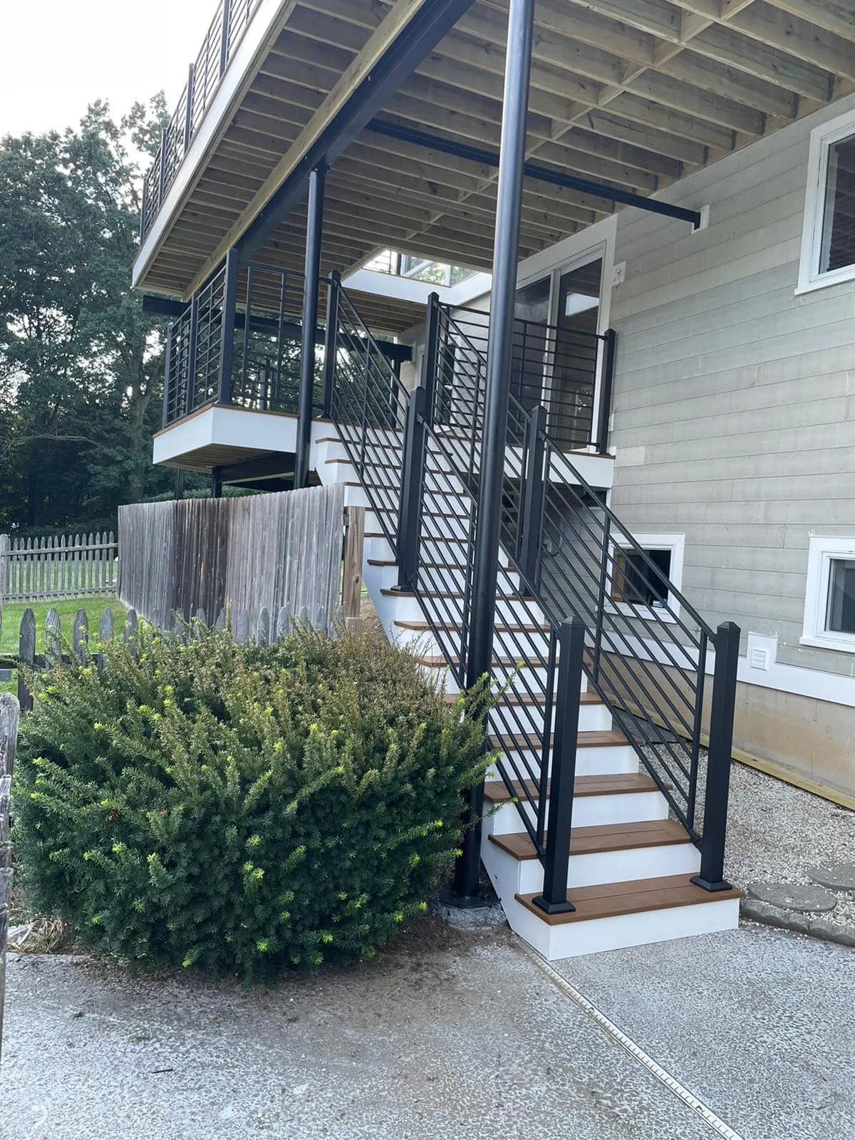 This composite deck renovation transformed an outdated and unsafe structure into a durable, modern outdoor living space. The design features NewTechWood decking paired with a Fortress railing system, offering long-lasting performance with a sleek aesthetic.
