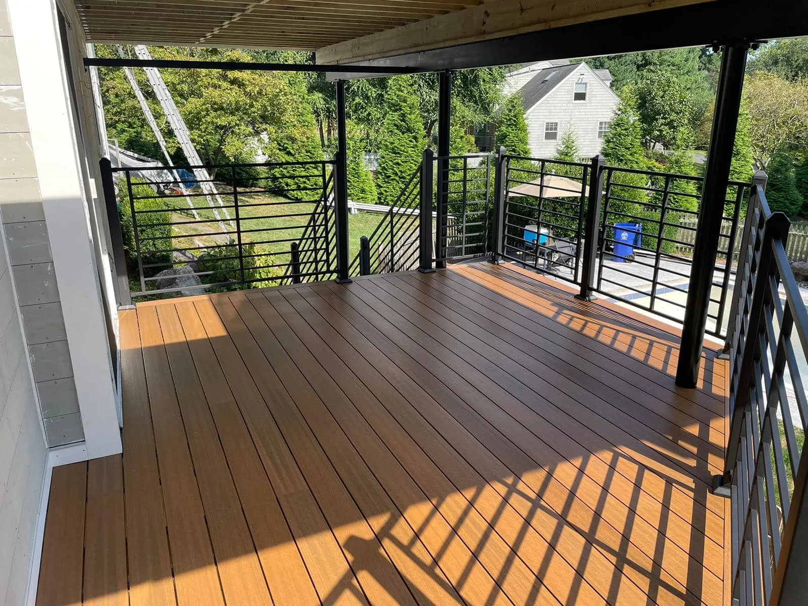 The NewTechWood decking was selected for its low maintenance and natural wood finish, while the Fortress railing offers sleek lines with black powder coating for maximum durability. Drainage, ventilation, and integration with the existing house facade were carefully considered.